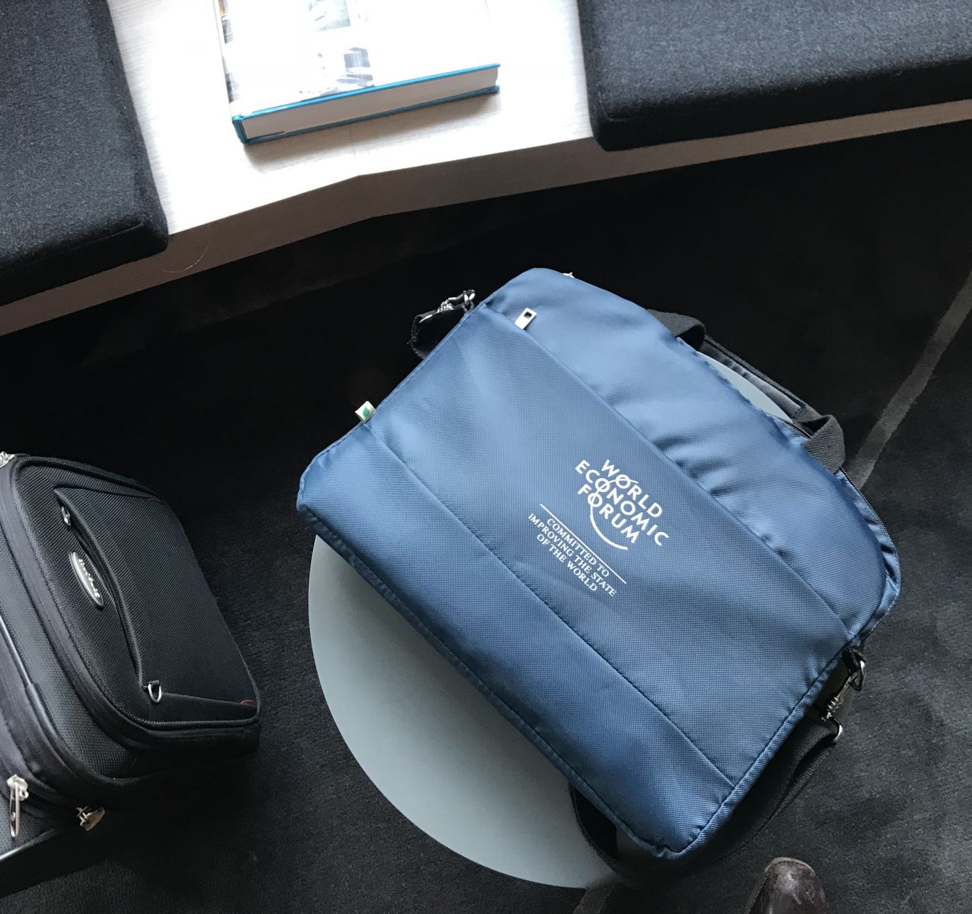It’s actually pretty great. It carried all my stuff for that week and came with a copy of Professor Schwabs’ The Fourth Industrial Revolution, a pen, a notebook and a map. Also, it’s in my colour.